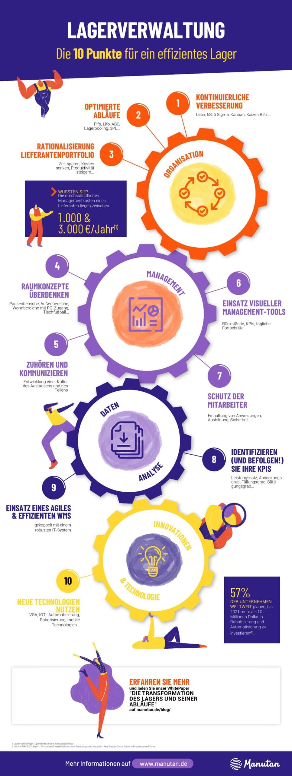 Lernen Sie, mit welchen 10 einfachen Punkten aus den Bereichen Organisation, Management, Datenanalyse und Innovationen & Technologie Sie Ihre Lagerverwaltung effizienter gestalten können.