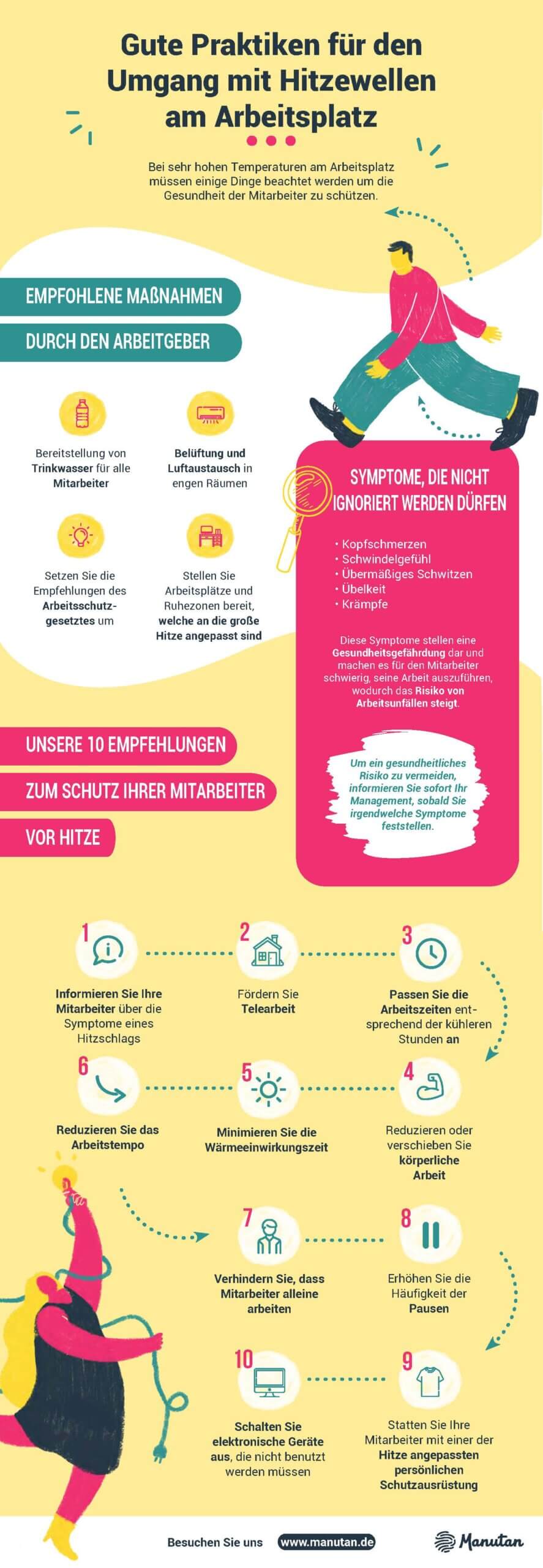 Insbesondere kann der Arbeitgeber über die ergriffenen Maßnahmen kommunizieren (Bereitstellung von Wasserstellen, Belüftungsvorrichtungen, Arbeitszeitregelungen) und den Mitarbeitern präventive Gesundheitstipps geben (regelmäßige Flüssigkeitszufuhr, Abschaltung nicht notwendiger elektrischer Geräte, die Wärme erzeugen, leichte Kost).