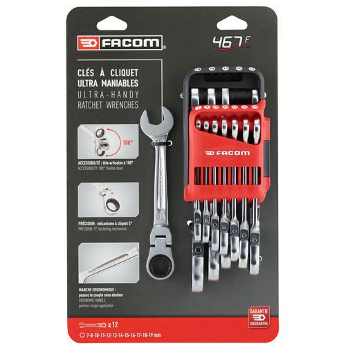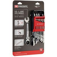 | Produktname | 12 Ring-Maulschlüssel in Set mit Gelenkratschen im Taschenetui - Facom, Reversible Ratsche: nein |