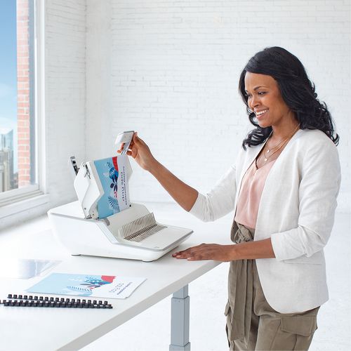 - Das 3-in-1-Bindegerät Lyra™ für das Binden, Heften und Stanzen von Dokumenten ist einfach in der Anwendung.