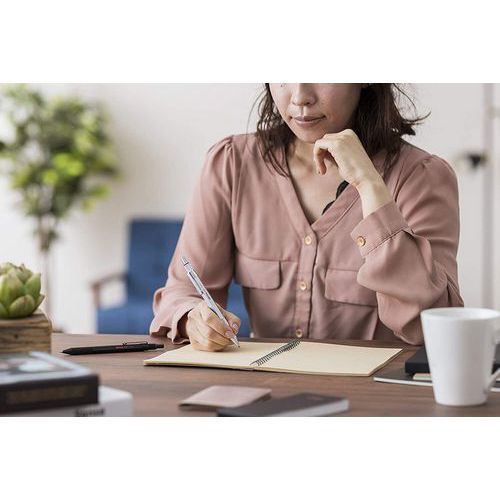 Dank der sechseckigen Form des Multifunktions-Kugelschreibers bleibt er dort liegen, wo er ist