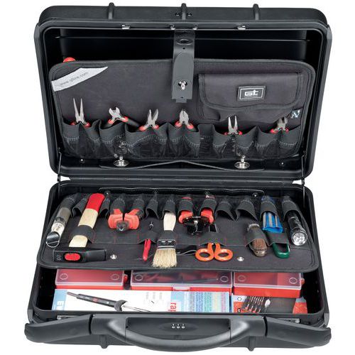 Koffer mit folgendem Inhalt: 1 Flachzange, 1 Seitenschneider, 1 Federzange 150 mm, 1 Abisolierzange J 22 bis 30, 1 Box mit 7 Torx-Schraubendrehern T6 bis T20, 1 Box mit 7 Schraubendrehern 1,4 - 2 - 2,5 - 3 - PH00 - PH0 - PH1, 1 Schraubendreher 2,5 x 50 isoliert 1000 V, 1 Schraubendreher 4 x 100 isoliert 1000 V, 1 Taschenlampe, 1 Satz aus 6 Feilen, Nadeln, 1 Schlosserhammer, 1 Elektrikerschere, 1 Elektrikermesser (1 Klinge), 1 Flachpinsel mit Chinaborsten 30 mm, 2 Aderklemmen schwarz und rot, 2 Aderzangen schwarz und rot, 2 Abzweigschnüre schwarz und rot, 3 Krokodilklemmen vernickelt, schwarz und rot, 1 Zange zum Abziehen der IC's mit 24 Füßen, 1 Edelstahllineal 200 mm, 1 Lötkolben, 1 Entlötpumpe 1, 1 Satz aus 6 Maulschlüsseln 3,2 bis 13 mm, 1 Satz aus 8 gewinkelten Inbusschlüsseln 1,5 bis 8 mm, 1 Box mit 6 Fächern, 1 Box mit 13 Fächern, 1 Box ohne Fächer