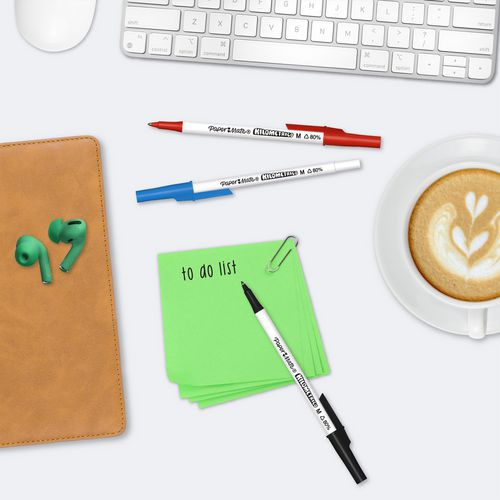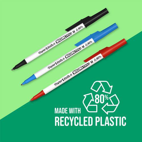 Realizzate per l'80% in plastica riciclata, le penne a sfera Paper Mate® Kilometrico garantiscono una scrittura affidabile e fluida, in qualunque situazione. Disponibile con inchiostro nero, blu e rosso e punta media da 1,0 mm per un aspetto solido e professionale.