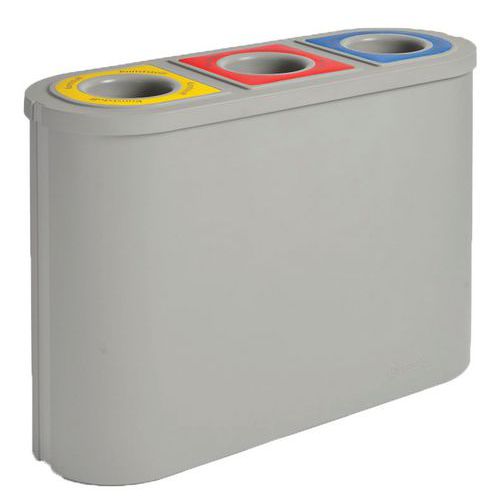 Abfallbehälter für Mülltrennung für 3 Abfallarten: Papier, Kunststoff und Restmüll (in 4 Sprachen).