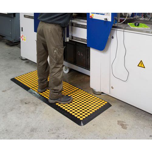 Antiermüdungsmatte, die das Gefühl von schweren Beinen reduziert, mit 2 schwarzen Mattenrändern Erhöhte Effizienz und gesteigerter Komfort durch Bestandteile unterschiedlicher Härtegrade Verminderter Druck auf die Fersen dank Luftkissensystem und Mattenstärke Die Antiermüdungsmatte Matlast isoliert gegen Kälte und absorbiert die Schwingungen der umliegenden Maschinen