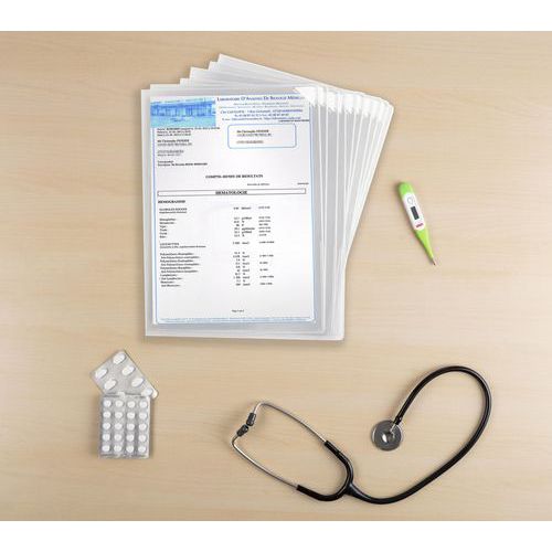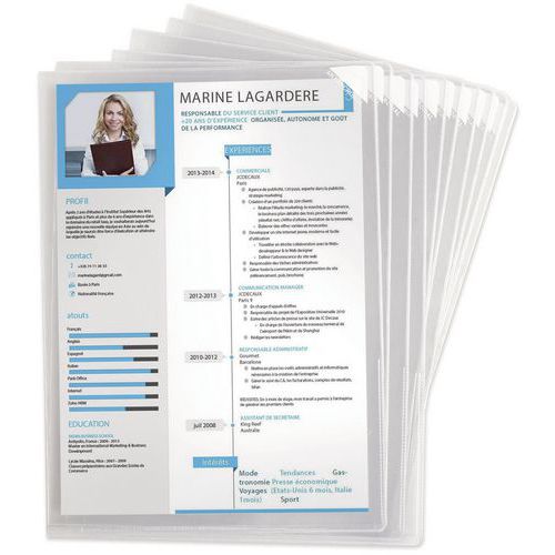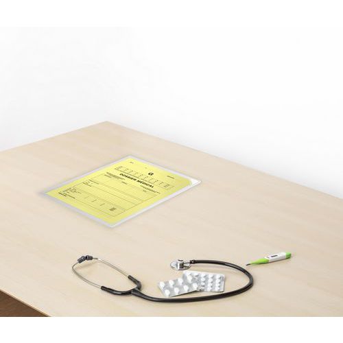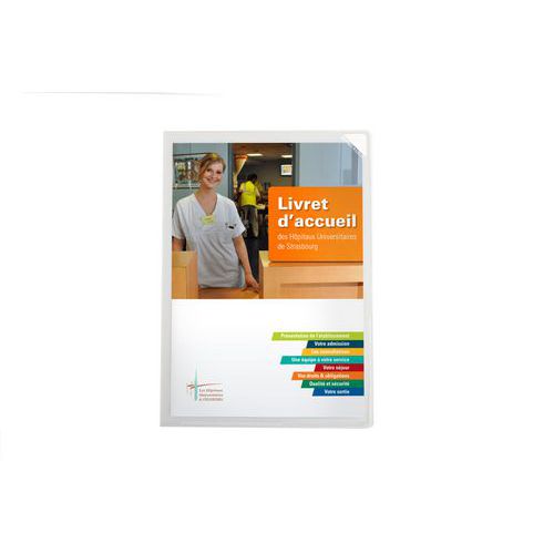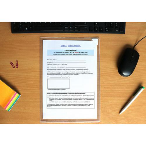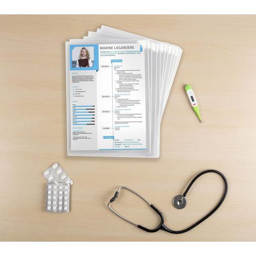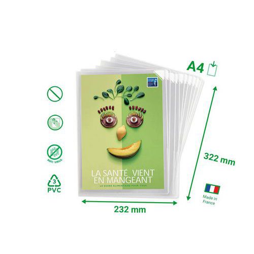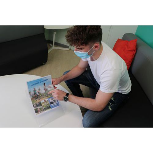 Consente la visualizzazione fronte-retro. 2 strisce adesive riposizionabili sul retro. Utilizzare in modalità verticale o orizzontale. Può contenere fino a 10 fogli di carta da 80 g.