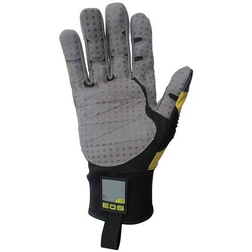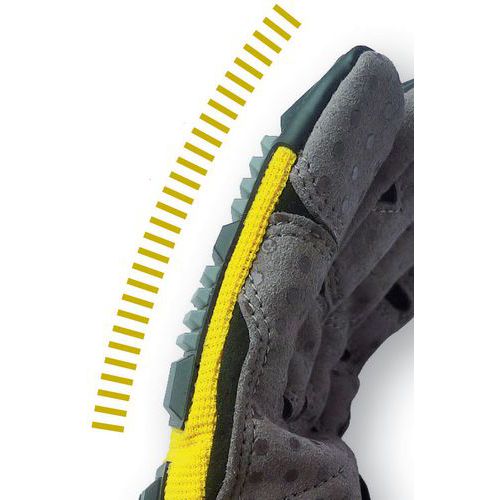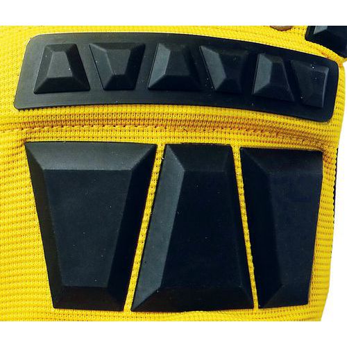 Rinforzo tra pollice e indice e sul palmo. Lavabile in acqua fredda per una maggiore igiene. Colore giallo per una maggiore visibilità. Badge di identificazione. Clip per cintura.
