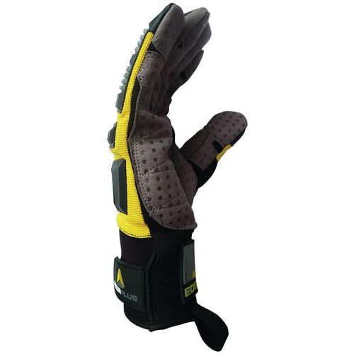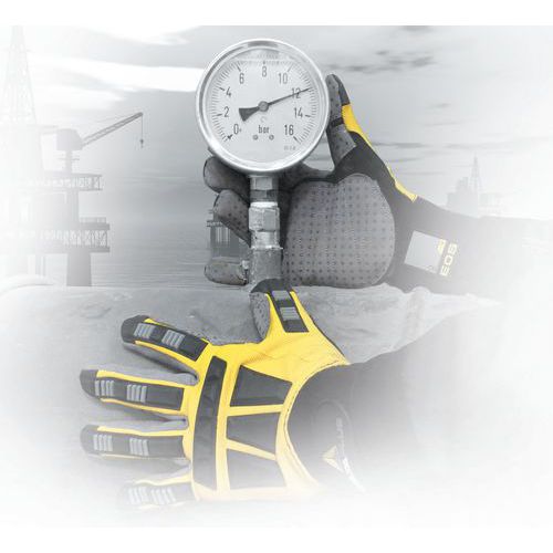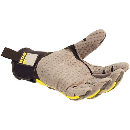 Doppellagige Polyamidschicht, rutschfest durch Handschuhinnenfläche aus Polyurethan mit PVC-Noppen.