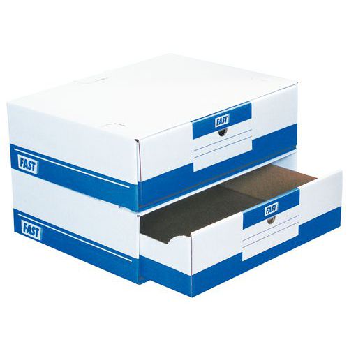 | Produktname | Archivkiste mit Schublade, Werkstoff: Karton, Farbe: Blau, Gesamtlänge: 28 cm, Gesamthöhe: 14 cm |