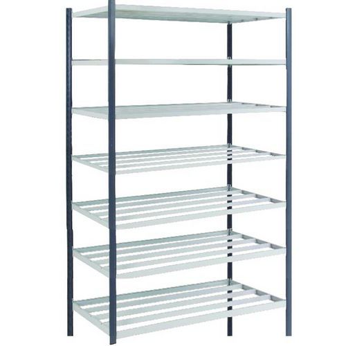 Regal mit schöner Epoxidbeschichtung und durchlüfteter Rohrstruktur. Der Fachboden lässt sich vollständig zerlegen durch direktes Einrasten am Rahmen. Hohe Stabilität ohne Kreuzverband für die einseitige und doppelseitige Nutzung. Komplette und schnelle Montage und Demontage ohne Schrauben oder Bolzen. T-Profil-Ständerrahmen ohne Perforation an der Vorderseite (40 x 37).