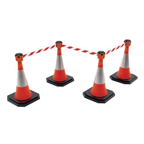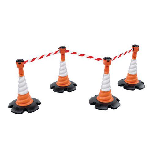 Jede Einheit verfügt über 9 Meter hochwertiges, voll zurückrollbares rot/weiß oder gelb/schwarz Band.