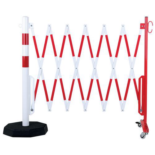 - Ausziehbare Schutzbarriere auf Rollen mit Bremsen auf einer Seite und Schutzpfosten auf der anderen.