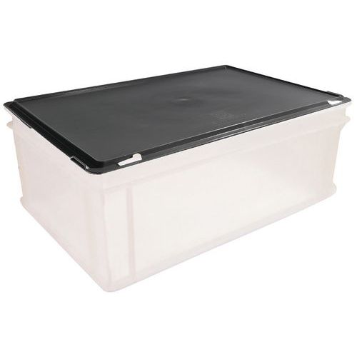 Stapelbarer Euronorm-Behälter mit Deckel. Mit Scharnierdeckel mit Verstärkungen sowie zwei Federverschlüssen. Zwei Etikettenhalter auf 2 Seiten (1 auf der langen Vorderseite des Behälters und 1 auf der kurzen Seite).