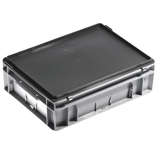 Stapelbarer Euronorm-Behälter mit Deckel. Mit Scharnierdeckel mit Verstärkungen sowie zwei Federverschlüssen. Zwei Etikettenhalter auf 2 Seiten (1 auf der langen Vorderseite des Behälters und 1 auf der kurzen Seite).
