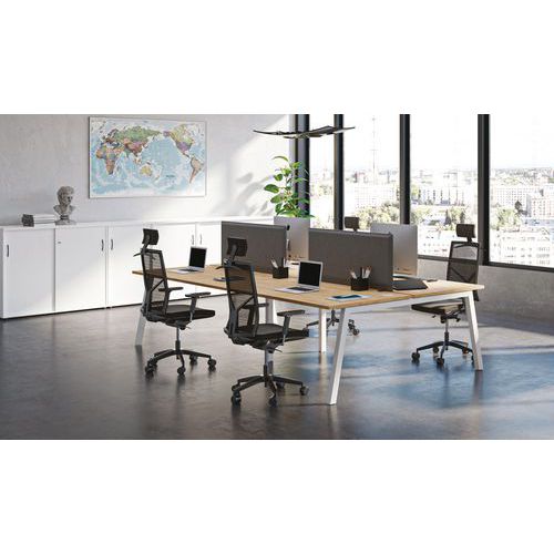 Schreibtisch Bench: ideal für Teamarbeit. Kabelträger: In der Platte integrierte Abdeckungen dienen zur Durchführung der Kabel. Melaminbeschichtete Platte Structurex® mit stoßfesten ABS-Kanten in 2 mm Stärke. Untergestell in schräger Bogenform A. Prodotto da completare con le postazioni Bench 2 Sharing Start. Progettato per promuovere il flexoffice e il coworking. Lavora in completa mobilità e comunica più facilmente con i tuoi colleghi.