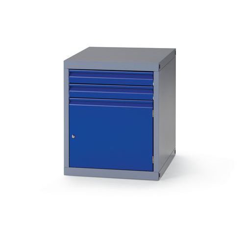 Vergrößern Sie Ihre Werkbank mithilfe dieses Blocks für Werkbänke mit Schrank und Schubladen. Schubladen auf Rollenlagern, daher leicht zu öffnen und zu schließen. Tür mit Schloss, um Dokumente sicher aufzubewahren. Zu 100 % öffnende Schubladen und Zentralverriegelung.