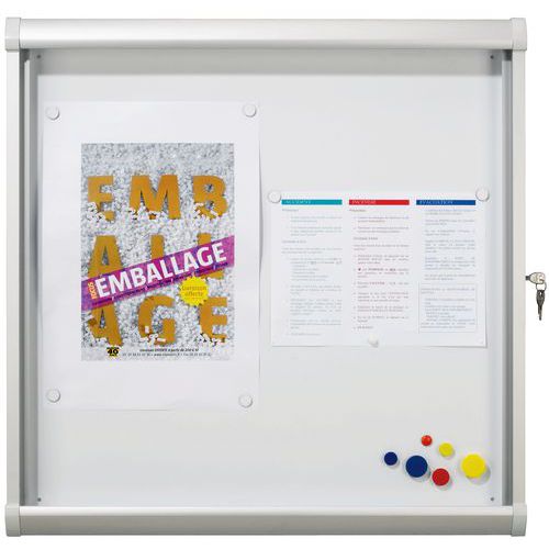 Schaukasten für Innenbereiche mit Rahmen aus natürlichem anodisiertem Aluminium für ein modernes Design. Praktisches Aushängen mit Magneten, die an der Magnetrückwand aus Metall haften, oder mit trocken abwischbarer Beschriftung. Praktische, verschließbare Flügeltür für maximale Sicherheit. Montage links- oder rechtsöffnend möglich. Sichere Aushänge dank Securit-Glastür.