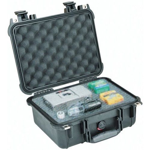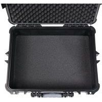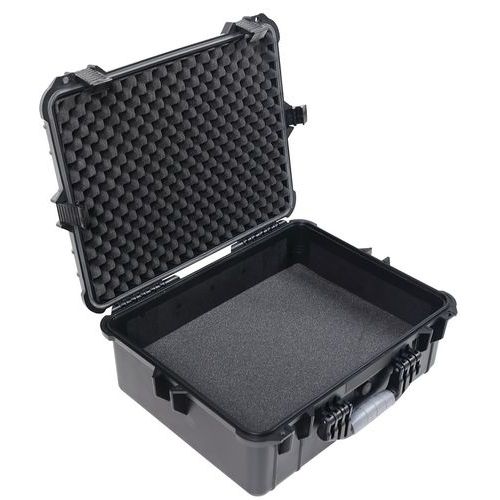 Stoßfester Koffer, wasser- und staubdicht. Optimaler Schutz durch Innenbeschichtung aus Noppenschaumstoff. Mit bei 90° selbstsperrenden Edelstahl-Scharnieren. Verriegelung durch Tastendruck unter dem Griff. Vorgeschnittener Schaumstoffboden mit Passform für verschiedenste Objekte.