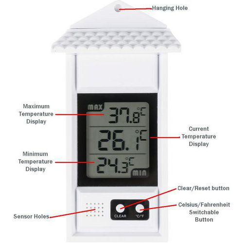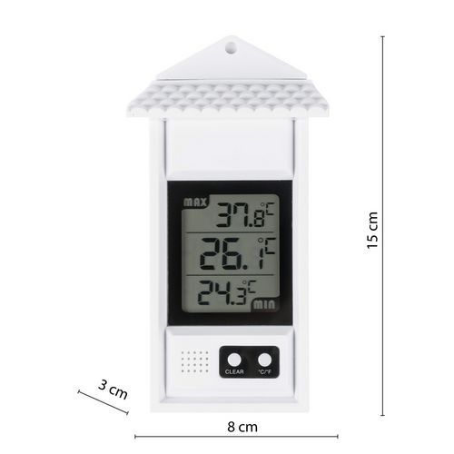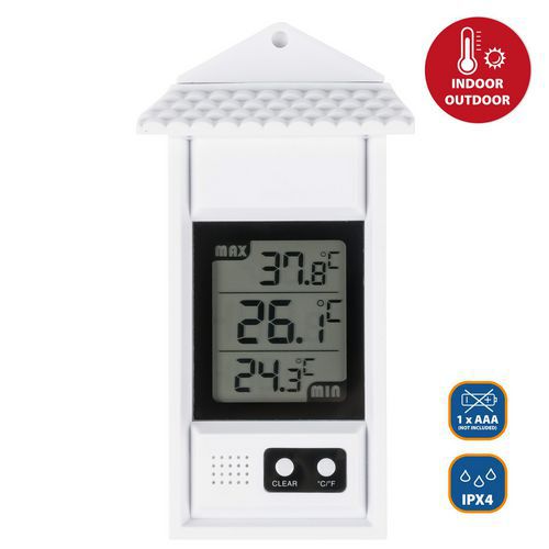 | Produktname | Digitalthermometer, Innen-/Außenbereich - Velamp, Max. gemessene Temperatur: 50 °C, Batterie geliefert: nein |