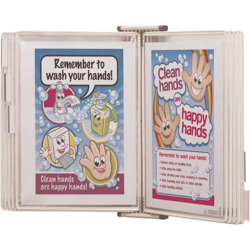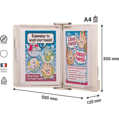 Antimikrobielles Drehwandhalterungskit für die hygienische Bereitstellung von Dokumenten. Schutzhülle aus organischen, natürlichen Produkten mit Silberionen, die Keime und Bakterien abhalten. Wandhalterung mit 4 Schutzhüllenhalterungen und 5 Reitern zur Indexierung. Mit 10 antimikrobiellen Sterifold-Drehzapfensichttafeln aus PVC.