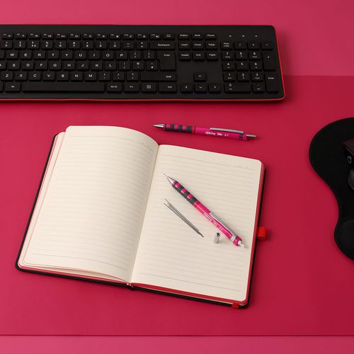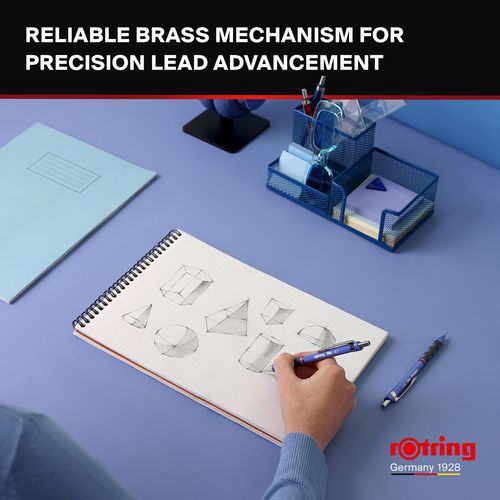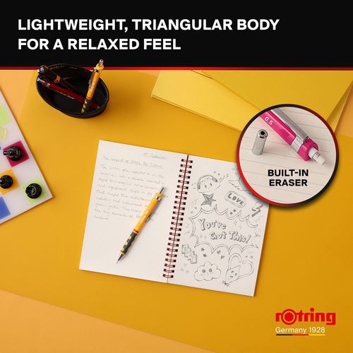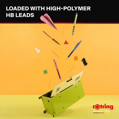 Druckbleistift HB 0,7 mm Rotring Tikky Serie, leicht, mit gummierter Soft-Touch-Griffzone für besonders komfortables Schreiben Nachfüllbar und mit HB-Minen aus hochpolymerem Material ausgestattet, Messingmechanismus für präzisen Minenvorschub Fester Minenführungsmantel verhindert Bruch und bietet freie Sicht auf das Papier - ideal für exaktes Zeichnen mit Lineal Speziell geformter, dreieckiger Schaft verhindert das Herunterrollen auf geneigten Flächen Gummierte Soft-Touch-Griffzone für hohen Schreibkomfort, mit integriertem Radierer unter der Kappe des Betätigungsknopfs