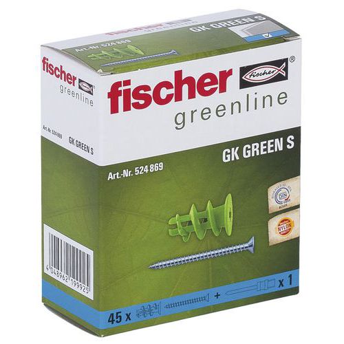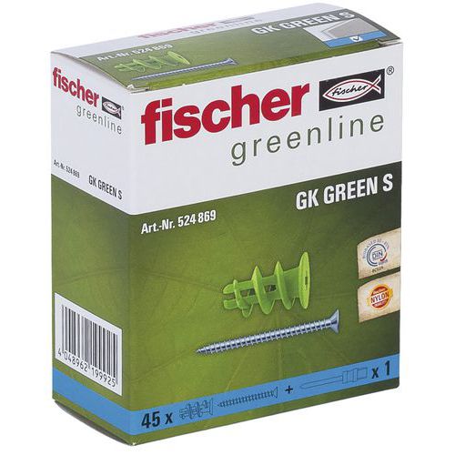 | Produktname | Dübel GK S Green, Steckerlänge: 22 mm, Werkstoff: Nylon, Typ Stütz: Putz, Recycelbare Verpackung: Ja - 100% |