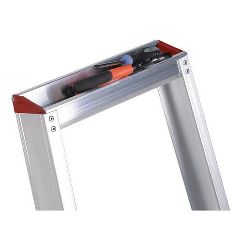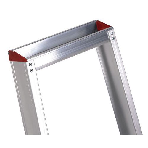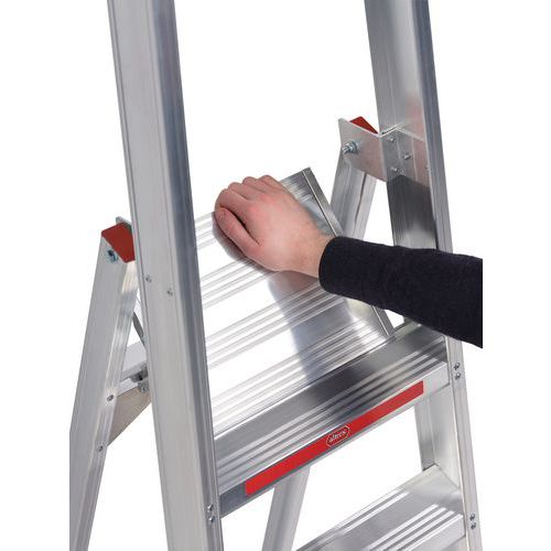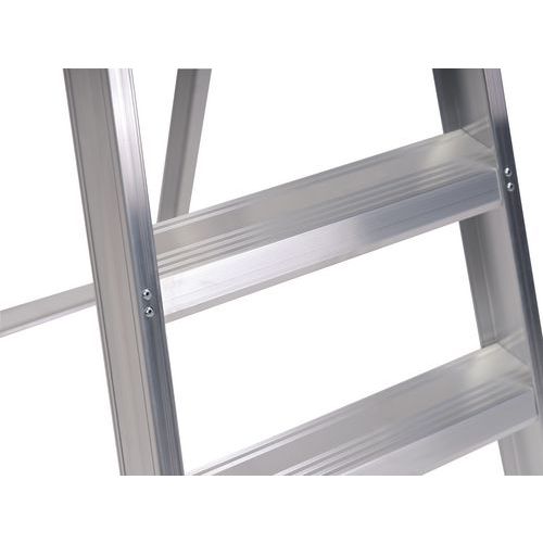 - Einseitig begehbare Stufenleiter für den professionellen Einsatz aus extrem leichtem Aluminium mit offenem Stufenprofil.