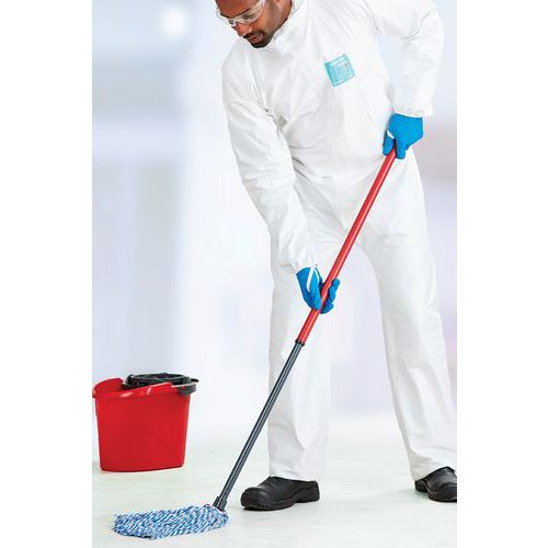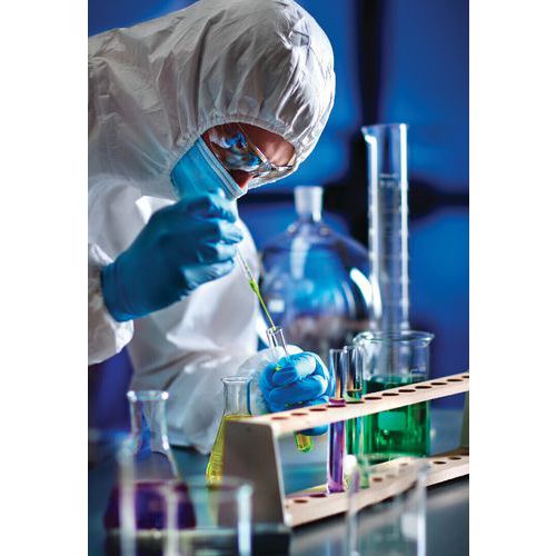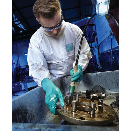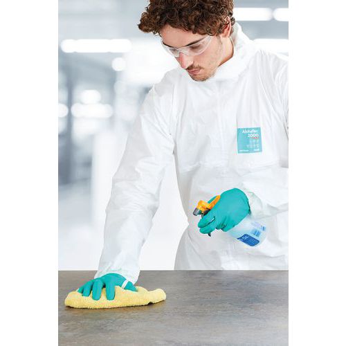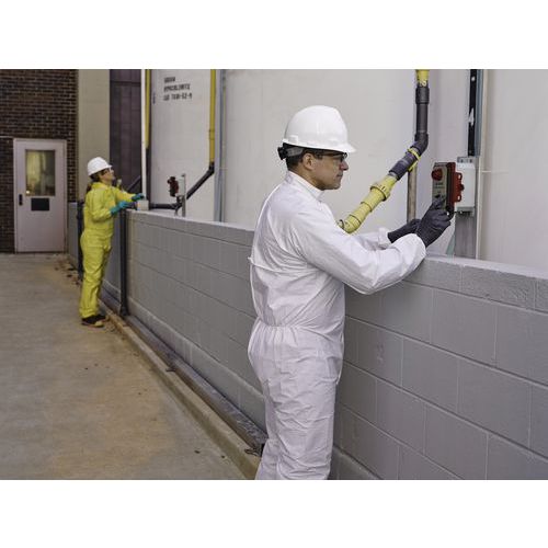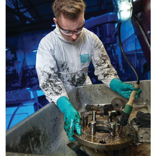 Umfasst einen Schutz aus SMMS-Vliesmaterial, der Partikel, Zerstäubungen und Spritzer von nicht brennbaren Flüssigkeiten abhält