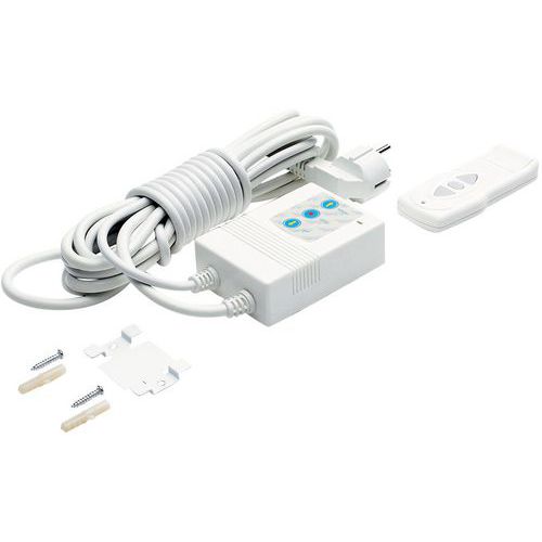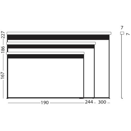Leiser Wandprojektionsschirm SMIT. Farbe: Mattweiß. Schwarzer Rand (3 oder 5 cm) an allen Seiten. Wandhalterung mit eingebautem Motor. Mit Befestigungspunkt für Wand und Decke.