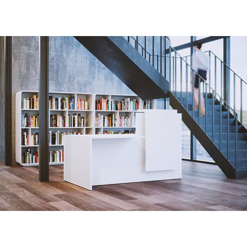 Empfangstheke mit Modulen für Personen mit eingeschränkter Mobilität rechts Das moderne und kompakte Möbelstück eignet sich besonders dafür, Personen mit eingeschränkter Mobilität zu empfangen Die Verkleidung dient als Empfangstisch für Besucher und kann auf zwei Weisen montiert werden, eine davon umfasst Abstandshalter, um freien Raum über der Arbeitsfläche und genug Platz für einen Computer zu schaffen