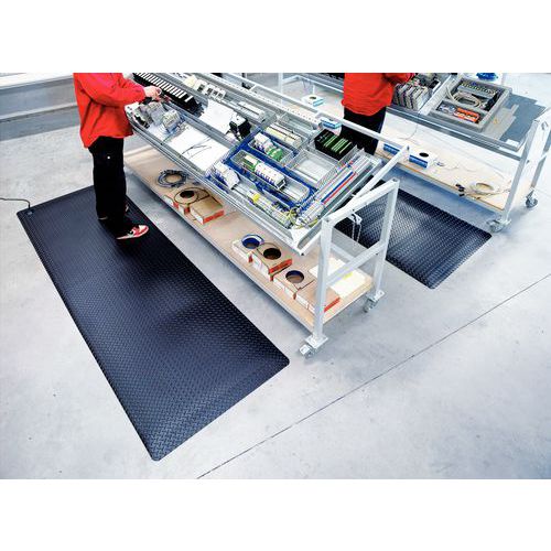 Die statisch ableitenden Anti-Ermüdungsmatten schützen vor elektrostatischen Ladungen und bieten den Arbeitern, die auf einer dicken Arbeitsplattform mit Vinylschaumstoffbasis stehen, Komfort und wirken Ermüdungserscheinungen entgegen