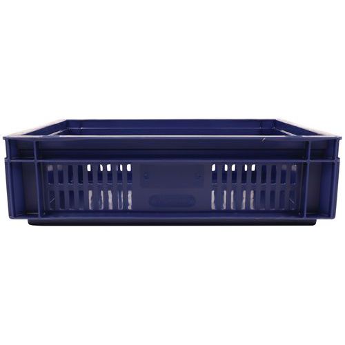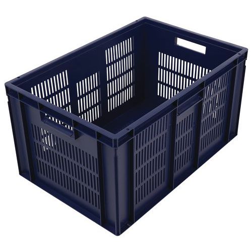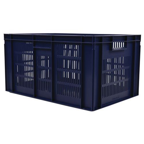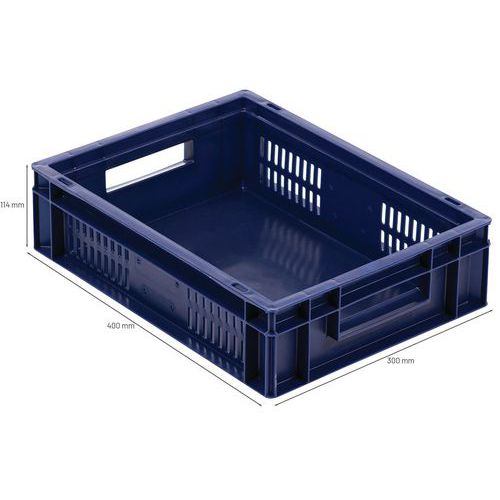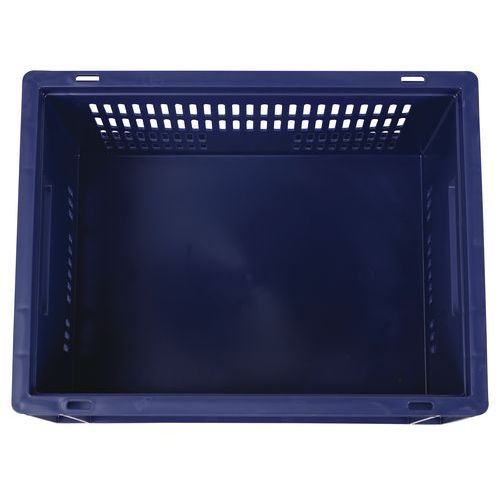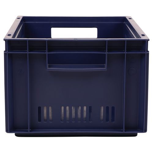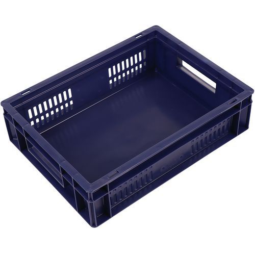 Blauer Euronormbehälter, hohe Stabilität beim Stapeln Garantiert gute Belüftung dank durchbrochener Wände Einfache Handhabung dank großen Grifföffnungen Beständig gegen Öle, Fette und zahlreiche Chemikalien