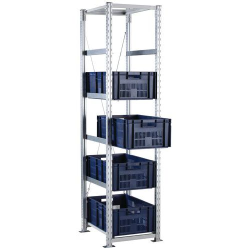 Spezialregal für Euronorm-Behälter, 400 x 300 mm und 600 x 400 mm Geeignet für Euronorm-Behälter mit einer maximalen Höhe von 230 mm Einfache Montage und Erweiterung mit Anschlussmodulen Kreuzverbände nicht enthalten Verwandeln Sie Ihre Transportbehälter in Lagerbehälter!