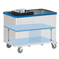 Ergonomischer Wagen ERGO Vario mit höhenverstellbarem Boden für eine konstante Arbeitshöhe Stabile, widerstandsfähige und leichte Konstruktion mit Legierung aus eloxiertem Aluminium Konstante Höhe zum Be- und Entladen, der Boden senkt sich kontinuierlich unter der Last des Produkts ab und hebt sich beim Entladen wieder Einfaches Verstellen des Bodenwiderstands durch Entnehmen oder Hinzufügen von Spannfedern Stoßschutz aus weichem und verschleißresistentem PVC an der oberen Wagenkante Robuste Rahmenstützen aus verzinktem Stahl Rollendurchmesser: 125 mm, Stahlmantel, verzinkt, nicht abfärbende Gummibereifung, Rollenlager, Fadenschutz Ergonomischer Schiebegriff