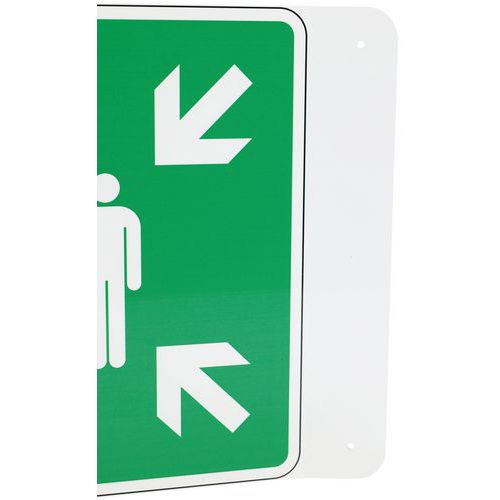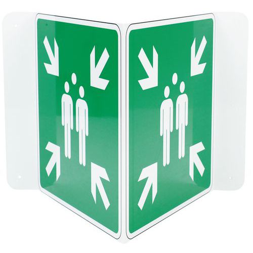 Legen Sie eine Sammelstelle fest und führen Sie mit diesem V-förmigen Fluchtwegschild ab sofort eine strukturierte Evakuierung Ihrer Mitarbeiter durch