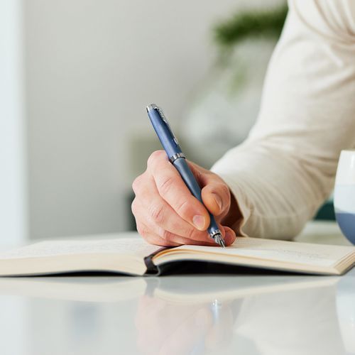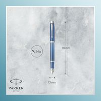 Die wunderschön gestaltete Kugelschreiberkollektion Parker IM Writing Rituals wurde mit größter Sorgfalt und Blick auf das Wohlbefinden der Anwender entwickelt Gewicht, Stil und Handhabung des Stifts sowie die Fließfähigkeit der Tinte schaffen ein luxuriöses Schreiberlebnis und fördern die Konzentration beim Schreiben Der beruhigende blaue Farbverlauf und die satinierte Metalloberfläche bilden einen harmonischen Kontrast zu den verchromten Details Mit Bezug auf die Farbtheorie wurde jede Farbe für ihre beruhigenden, inspirierenden oder belebenden Eigenschaften ausgewählt Der Parker IM Writing Rituals wird in einem eleganten Etui mit einer passenden Stifthülle präsentiert Dieser moderne Füllfederhalter kann mit den Tintenpatronen Quink oder dank des Tintenkonverters auch mit einem Tintenfass verwendet werden Ermöglicht ein besonders elegantes Schriftbild