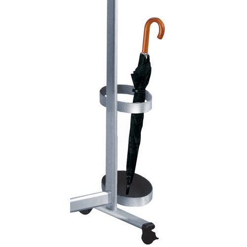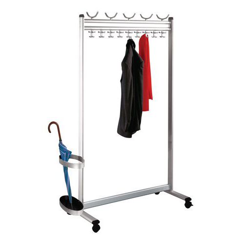 Hochwertige Garderobe aus Aluminium mit sehr großer Kapazität. Kleiderständer mit Haken für Hüte und Kleidungsstücke. Dank der vier getrennt feststellbaren Rollen ist die Garderobe mobil. Der Schirmständer kann links oder rechts montiert werden.