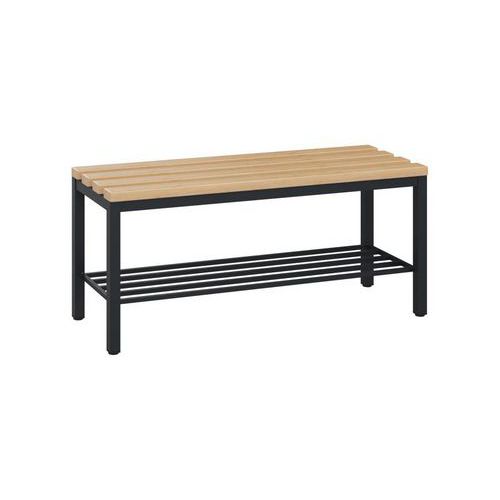 Bank mit Schuhgitter für Garderobenschrank in hochwertiger Lackoptik Sitzfläche aus leicht abgerundeten Latten aus Buchenholz Struktur aus stabilem Vierkantrohr für eine intensive Nutzung Stellfüße zur Justierung. Stabile, extrem robuste Garderobenbank. Zeitersparnis: wird vormontiert geliefert
