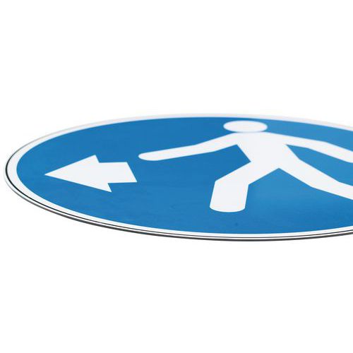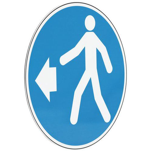 Mit diesem Hinweisschild mit Fußgänger auf der linken Seite machen Sie deutlich, dass Fußgänger sich links aufhalten und bewegen müssen, um Zusammenstöße mit anderen Personen und Fahrzeugen zu vermeiden
