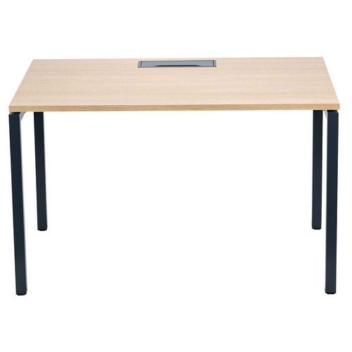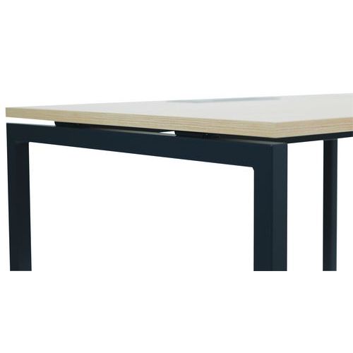 Gerader Schreibtisch mit melaminbeschichteter Platte, Stärke 25 mm, und 2 mm starken ABS-Kanten. 2 Verstärkungstraversen aus Metallrohr, 40 x 20 mm. Konstruktion aus geraden Metallfüßen 40 x 40 mm mit Kunststofffüßen zum Nivellieren. Die Platte ist für ein einfaches Kabelmanagement mit einer Kabeldurchführung mit Klappe versehen.