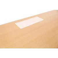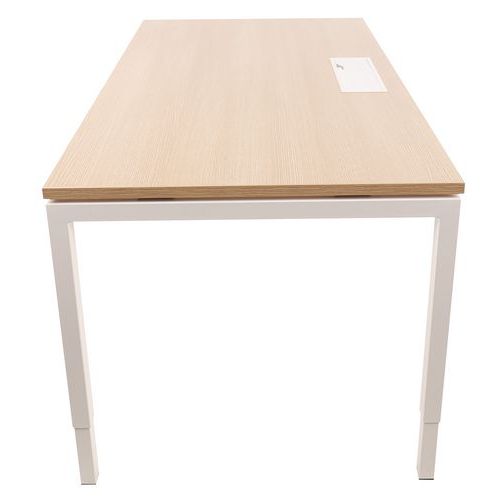 Gerader, auf Fußhöhe höhenverstellbarer Schreibtisch. Melaminbeschichtete Platte, Stärke 25 mm, mit 2 mm starken ABS-Kanten. 2 Verstärkungstraversen aus Metallrohr, 40 x 20 mm. Konstruktion aus geraden Metallfüßen 40 x 40 mm mit Kunststoff-Stellfüßen zum Nivellieren. Die Platte ist für ein einfaches Kabelmanagement mit einer Kabeldurchführung mit Klappe versehen.
