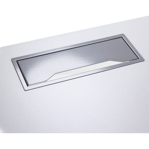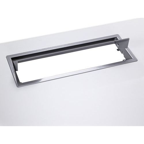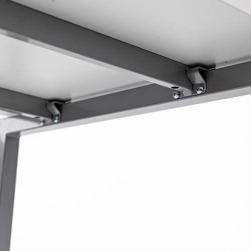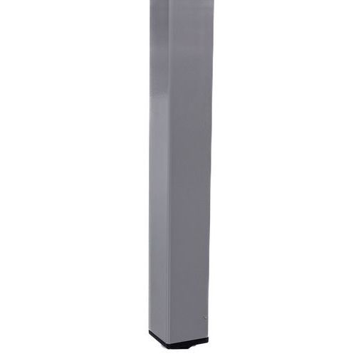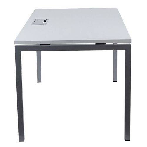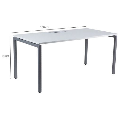Gerader Schreibtisch mit melaminbeschichteter Platte, Stärke 25 mm, und 2 mm starken ABS-Kanten. 2 Verstärkungstraversen aus Metallrohr, 40 x 20 mm. Konstruktion aus geraden Metallfüßen 40 x 40 mm mit Kunststofffüßen zum Nivellieren. Die Platte ist für ein einfaches Kabelmanagement mit einer Kabeldurchführung mit Klappe versehen.