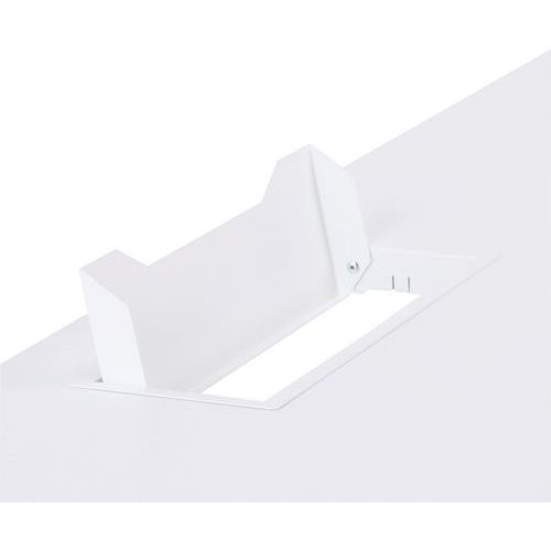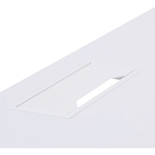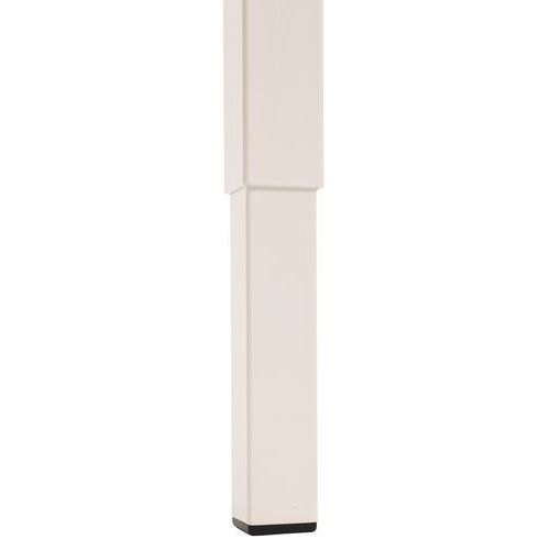 Gerader, auf Fußhöhe höhenverstellbarer Schreibtisch. Melaminbeschichtete Platte, Stärke 25 mm, mit 2 mm starken ABS-Kanten. 2 Verstärkungstraversen aus Metallrohr, 40 x 20 mm. Konstruktion aus geraden Metallfüßen 40 x 40 mm mit Kunststoff-Stellfüßen zum Nivellieren. Die Platte ist für ein einfaches Kabelmanagement mit einer Kabeldurchführung mit Klappe versehen.