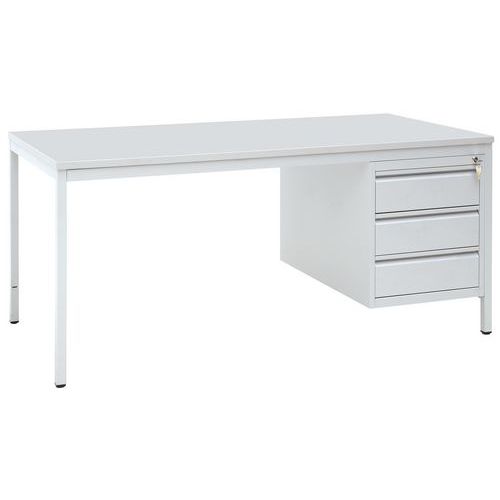 Mobili estremamente solidi in acciaio laccato epossidico bianco. Cassetti con chiusura centralizzata (consegnati con 2 chiavi), dotati di maniglia continua. Scatole di sospensione da montare sotto il telaio. Semplice e robusta, questa gamma di scrivanie è senza tempo.