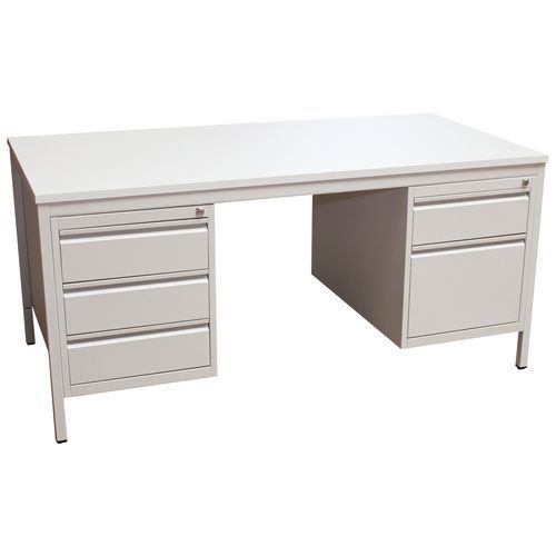 Mobili estremamente solidi in acciaio laccato epossidico bianco. Cassetti con chiusura centralizzata (consegnati con 2 chiavi), dotati di maniglia continua. Scatole di sospensione da montare sotto il telaio. Semplice e robusta, questa gamma di scrivanie è senza tempo.
