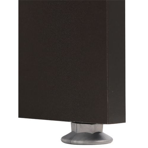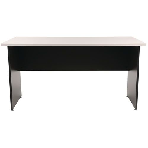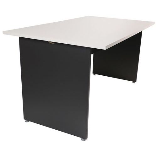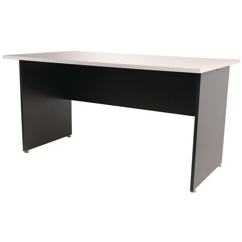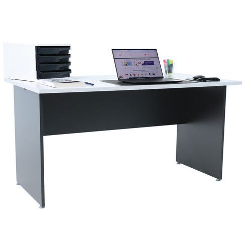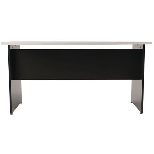 Moderner und praktischer Schreibtisch. Von der Platte zurückgesetzte Struktur-Sichtblende für Kabeldurchführung. Füße mit Stellzylindern für Nivellierung. Aussparung für Kabeldurchführung im oberen Teil.