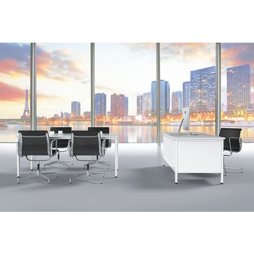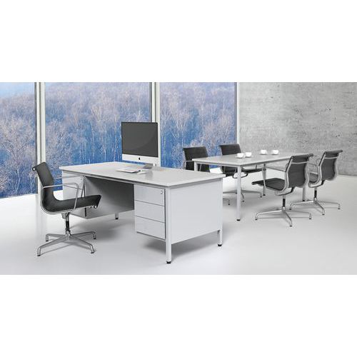 Robuster und zeitloser Schreibtisch. Entspiegelte, hochdichte Platte (Dicke 25 mm). Zentralverriegelung des Kastens. Der Kasten kann sowohl rechts als auch links eingebaut werden. Standfüße mit Einstellmöglichkeit. Selbsttragender Rahmen und Sichtblende aus Metall.