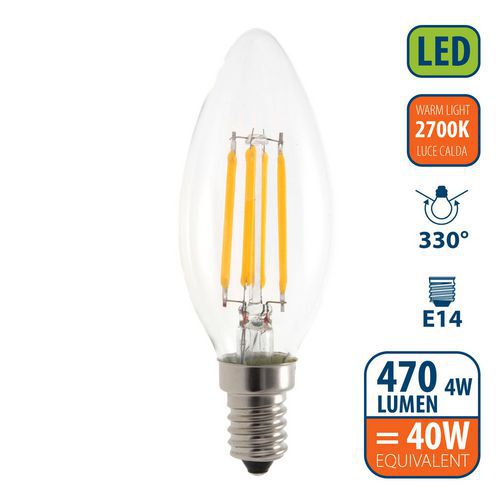 Mit seiner Lebensdauer von 20.000 Stunden (mehr als der Marktstandard) kann das Leuchtmittel mehr als 15 Jahre halten (bei einer täglichen Verwendung von 3 Stunden) Sie liefert binnen kürzester Zeit 470 Lumen, ohne dass Sie warten müssen, dass sich die Glühbirne aufwärmt Transparenter Diffusor, der für ein ähnliches Licht wie bei früheren Glühlampen sorgt Die „LED-Leuchtfaden“-Technologie sorgt für einen hyperdiffusen 330-Grad-Strahl