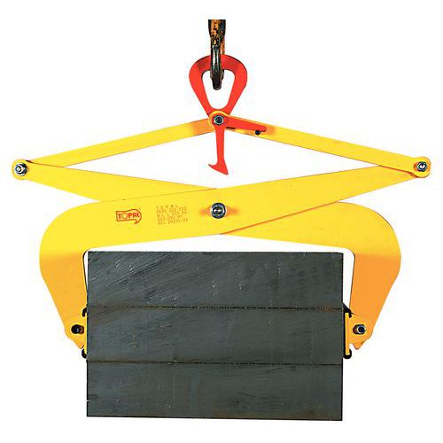 Die Zangen sind ausgestattet mit automatischer Verriegelung in offener Position, sodass die Last ohne Eingriff des Benutzers abgesetzt werden kann. Austauschbare, mit Gummi belegte Backen verhindern die Beschädigung der Ladung. Heben von Lasten ohne Beschriftung mit parallelen Flächen. Zangen blockiert alle Arten von Material.