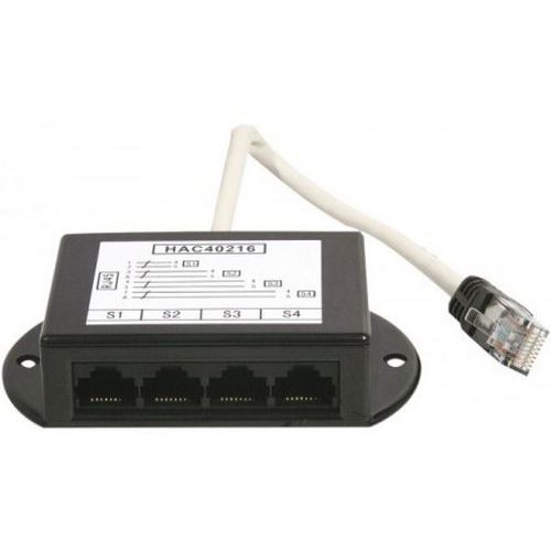 - Schwarzes Kunststoffgehäuse, mit RJ45-Ausgangsbuchsen, mit Kabel.